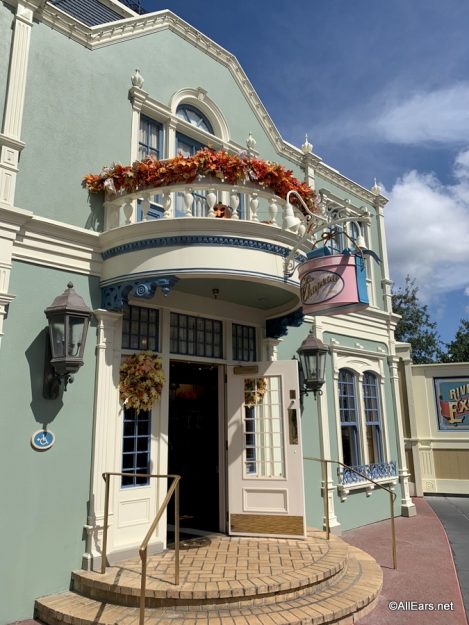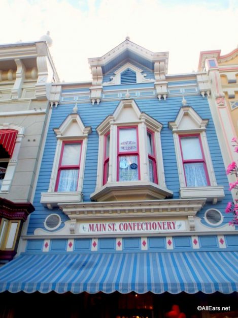 Confectionery has a few different entrances. This bright blue facade is pretty. And here’s your friendly reminder to look up when you’re exploring Main Street! There are lots of homages to Disney icons and Imagineers!
