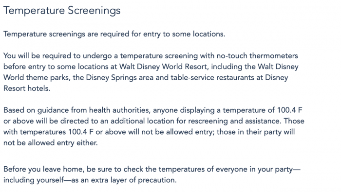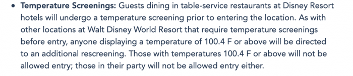 Disney’s website now reflects the updated temperature screening policy, with added verbiage regarding “table-service restaurants at Disney World Resort hotels.”