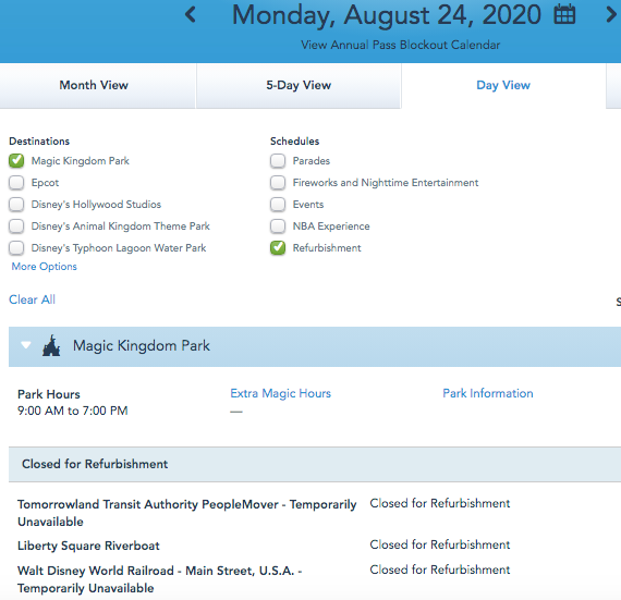 The Liberty Square Riverboat is removed from the refurbishment calendar beginning on August 31st.