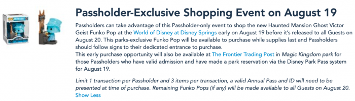 Disney is noting that there is a limit of one transaction per Passholder and three items per transaction. Disney also mentions that if any of the Funko Pops are available, they will be sold to the general public on August 20th.