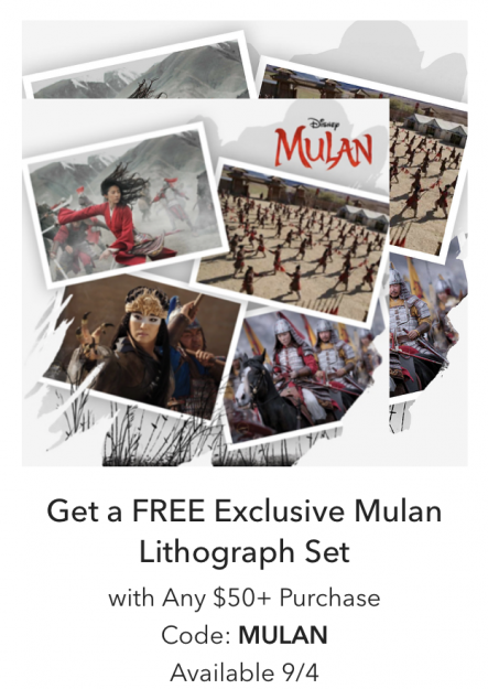 When you purchase $50 of merchandise (preferrably Mulan themed, you know), you’ll receive the lithographs for free with stills from the movie! And, they already look STUNNING! The Mulan Lithograph Set will be available the same day the movie premieres on September 4th. You can catch us with one hand shopping online and the other pressing play on Disney+ when we watch Mulan this Friday!