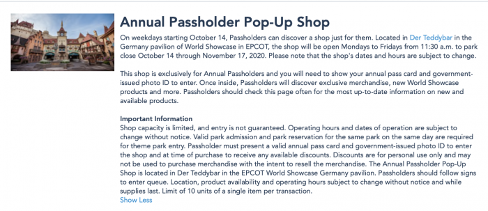 The new shop will open tomorrow, October 14th and be located in Germany’s Der Teddybar at EPCOT. The shop’s hours are Monday through Friday from 11:30AM to park close. The shop will include exclusive Annual Passholder, new World Showcase merchandise, and more. Much like all Disney World shops, capacity is limited and entry is not guaranteed. Guests will need to bring their Annual Pass and government-issued ID to enter.