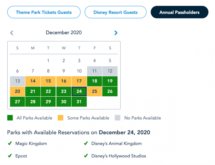 Annual Passholders, on the other hand, still have limited availability throughout the month. There are some days though that have full availability at all of the parks, including Christmas Eve and New Year’s Eve. On Christmas Day, the only park that is currently out of reservations is Magic Kingdom.