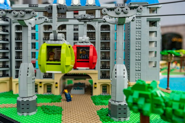 Since the Disney Resort shows off the Skyliner, pool, waterslide, official monogram, and more, the LEGO Master Model Builders spent more than 300 designing the model. The Disney’s Riviera Resort LEGO Display is made of 45,000 LEGOs, weighs 100 pounds, and has a 84-inch-by-66-inch structure.