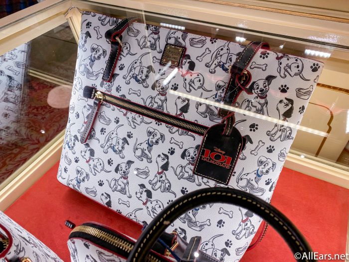 As we were walking through Magic Kingdom today, we spotted this display in Uptown Jewelers on Main Street, U.S.A. announcing a new collection of Dooney & Bourke Bags inspired by 101 Dalmatians! All of the bags are covered in the same pattern, which features some adorable puppies from 101 Dalmatians, paw prints, bones, and more.