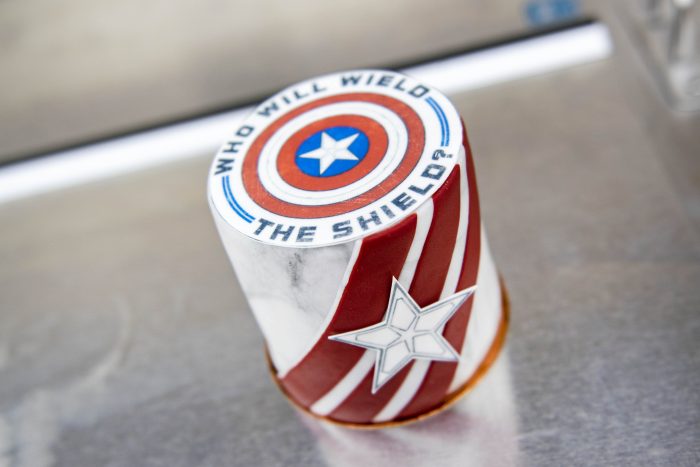 Over at Disney Springs, Amorette’s Patisserie has a new petit cake in honor of the first episode of The Falcon and the Winter Soldier for a limited time! It is decorated with Captain America’s shield and says “Who will wield the shield?” on top! The cake poses a great question!