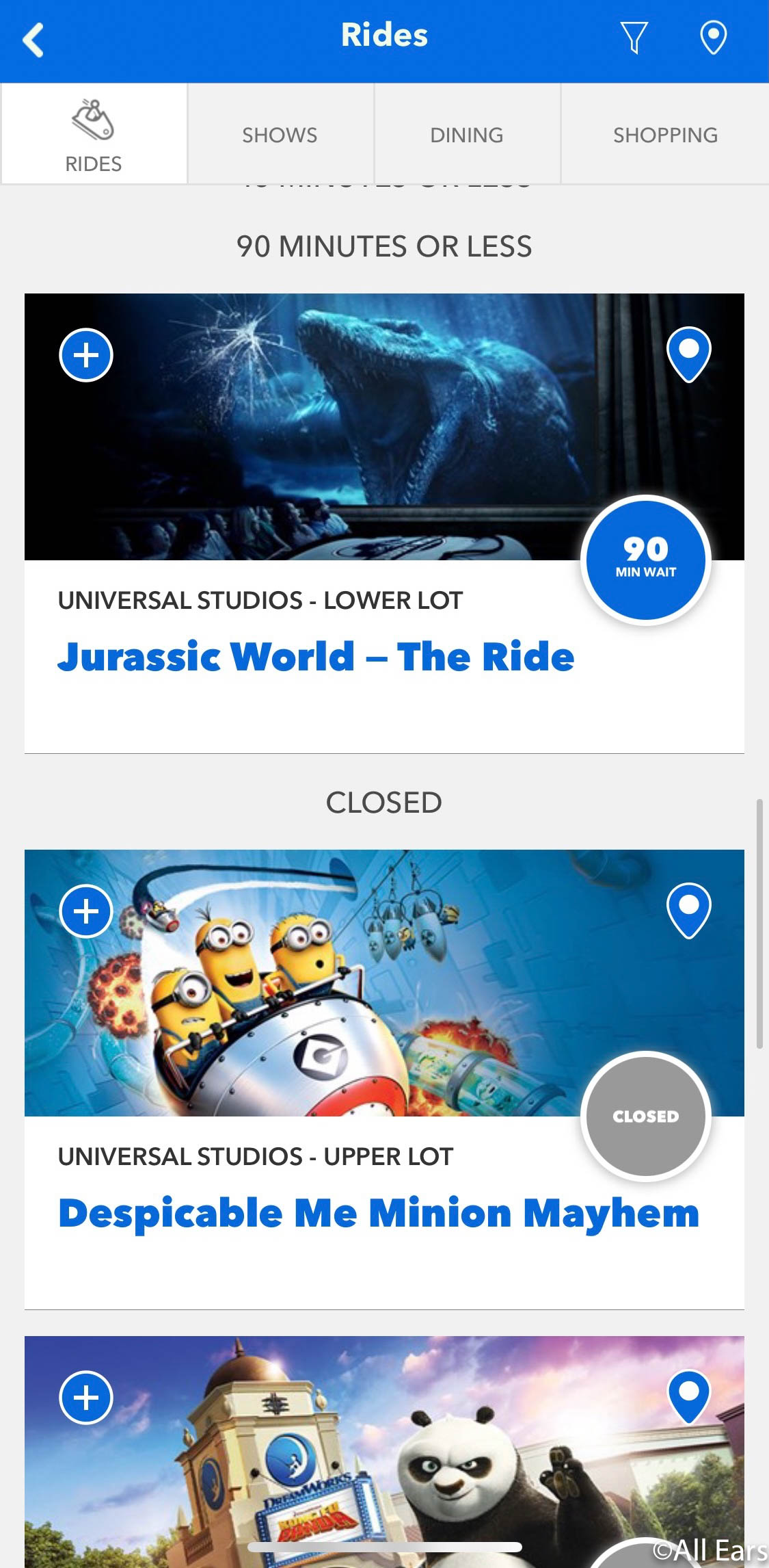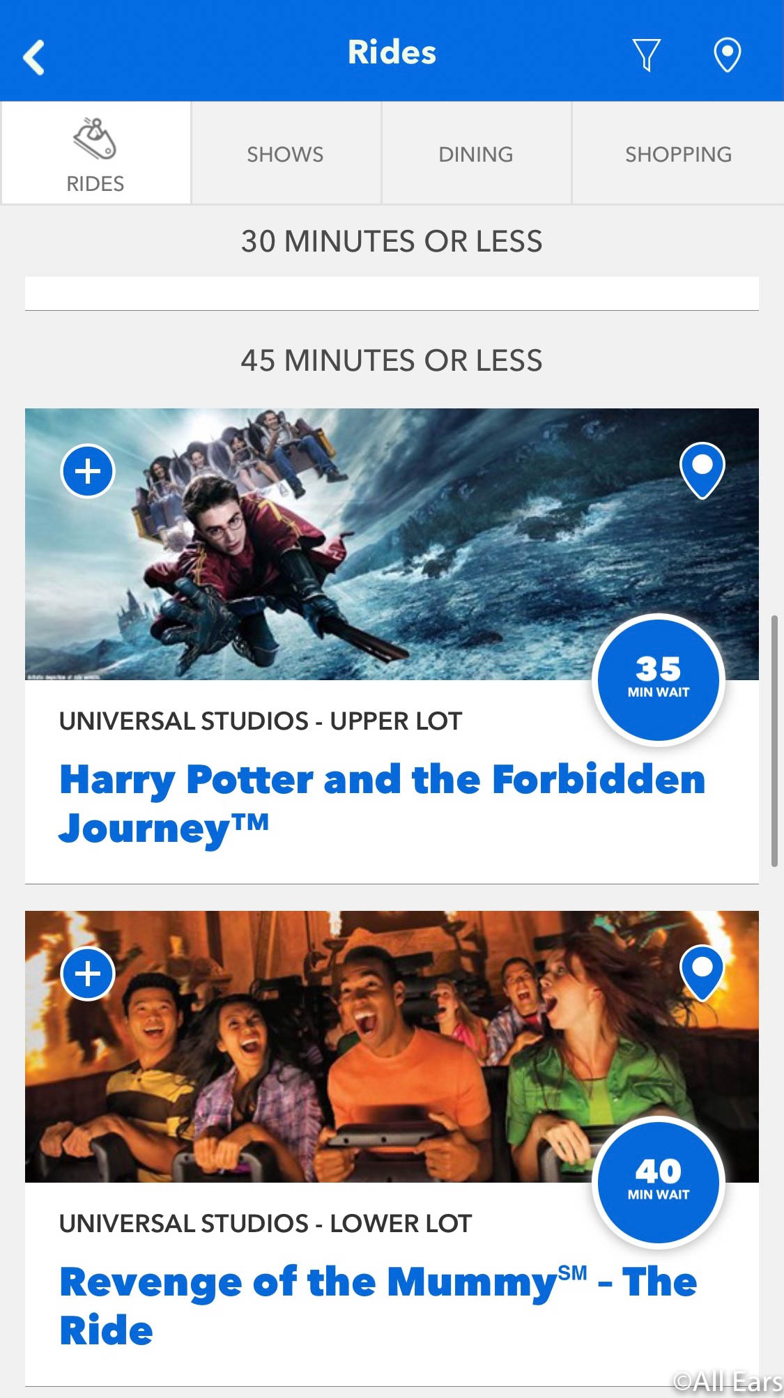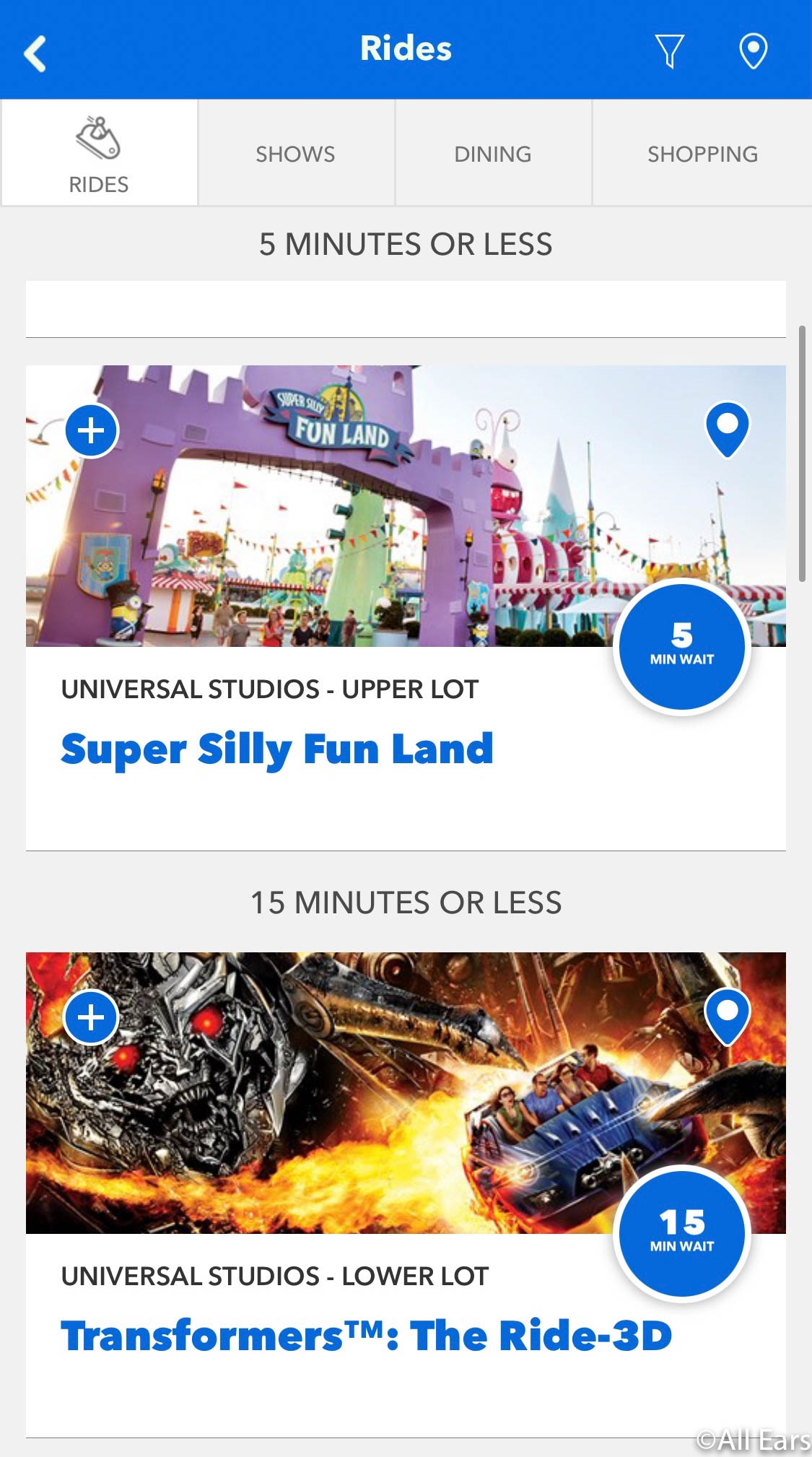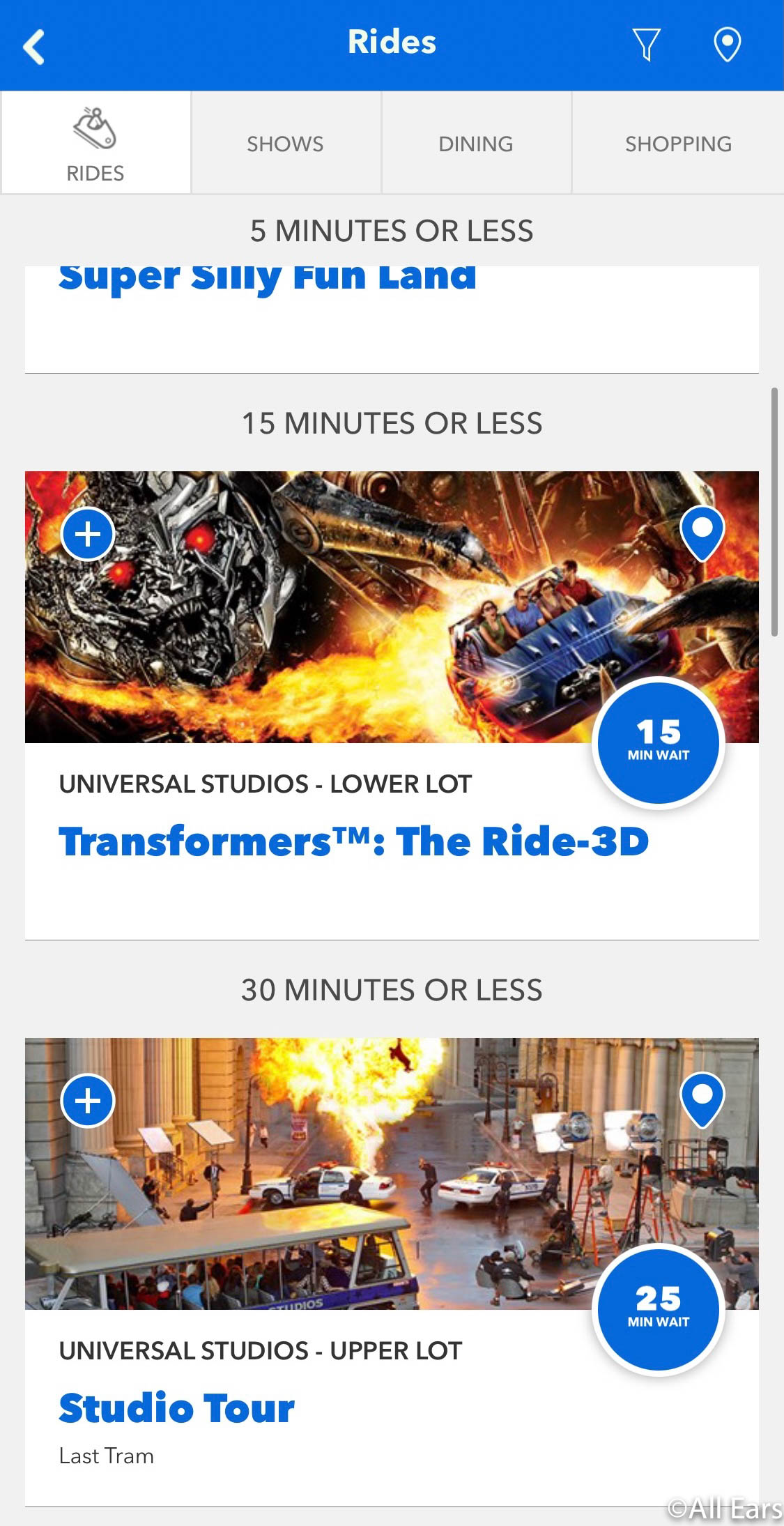 When we first checked the Universal Hollywood app, we were able to take a look at the wait times divided up into sections of under 5 minutes and 15 minutes…