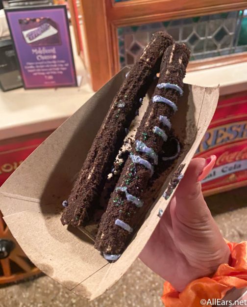Lastly, there’s the Maleficent Churro that can be found at the snack cart on Main Street, U.S.A.! This is a churro covered in chocolate cookie crumbles drizzled with purple icing and topped with green and purple sprinkles and costs $7.