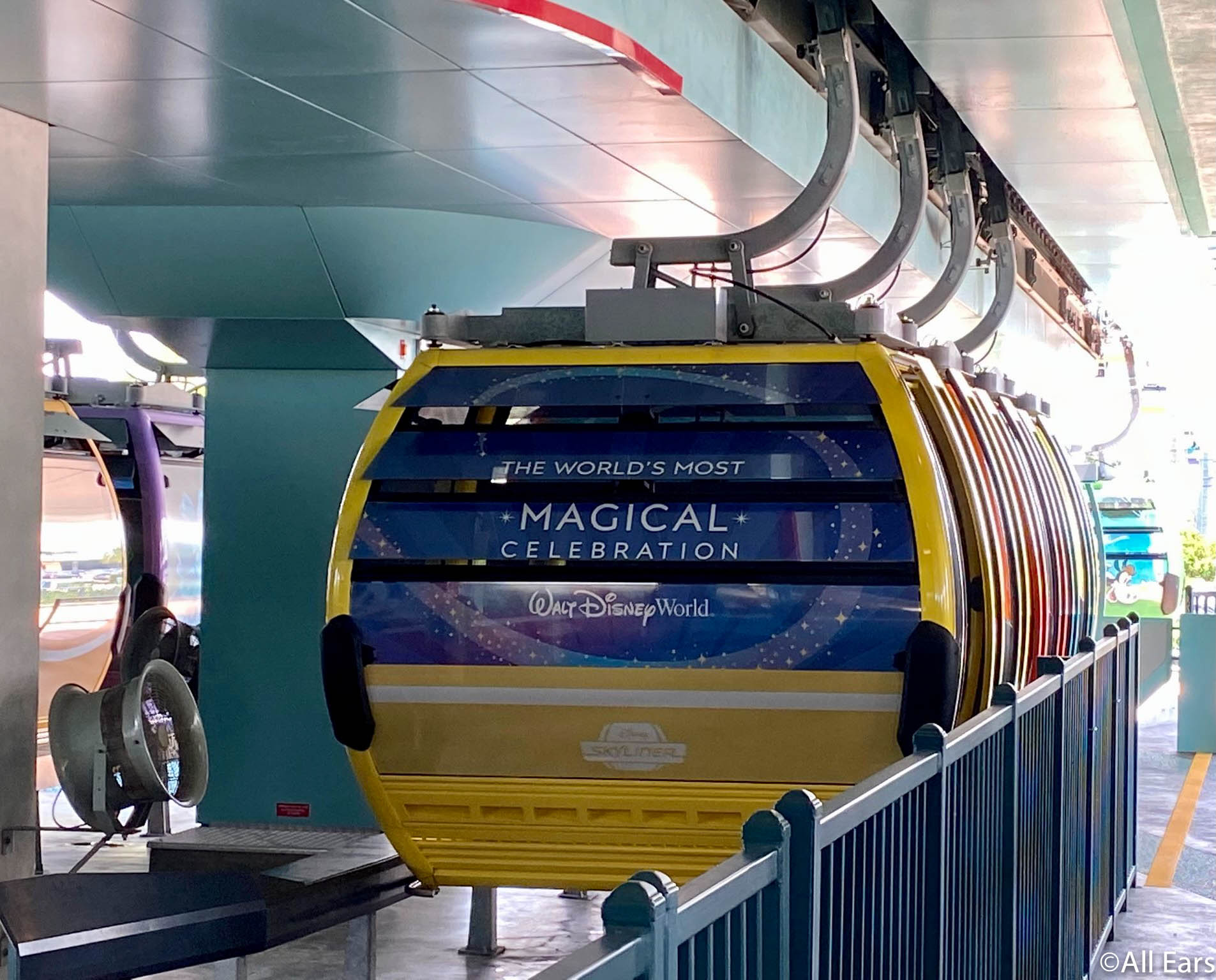 Disney’s Skyliner Gondolas are even getting a little extra magic with a 50th anniversary wrap in time for the celebrations starting October 1st! While the outside colors of the gondolas remain the same, the windows feature the same anniversary design we spotted earlier on the Disney Buses.
