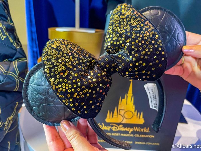 The first pair of ears is black faux leather with the 50th Anniversary logo and Cinderella Castle imprinted on the ears. The bow is black with golden sequins — quite a bold look!
