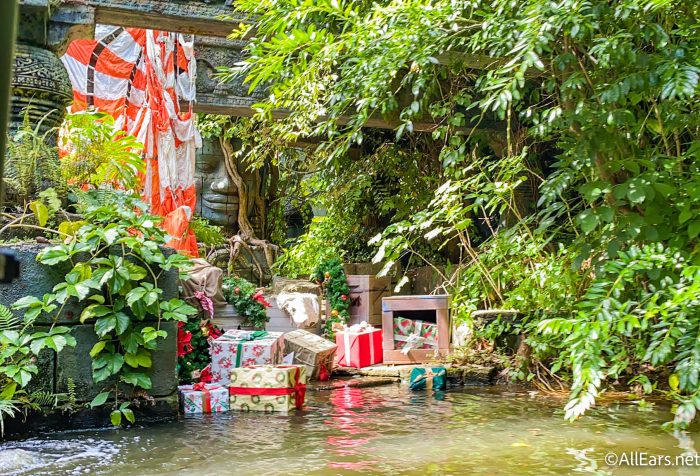 We’ve been checking out decorations in Magic Kingdom, gingerbread displays at the resorts, and merchandise online this morning, but there’s one big thing in Disney World we need to discuss…the JINGLE CRUISE! The holiday overlay of Jungle Cruise is back, and we’re excited to share photos from our ride.