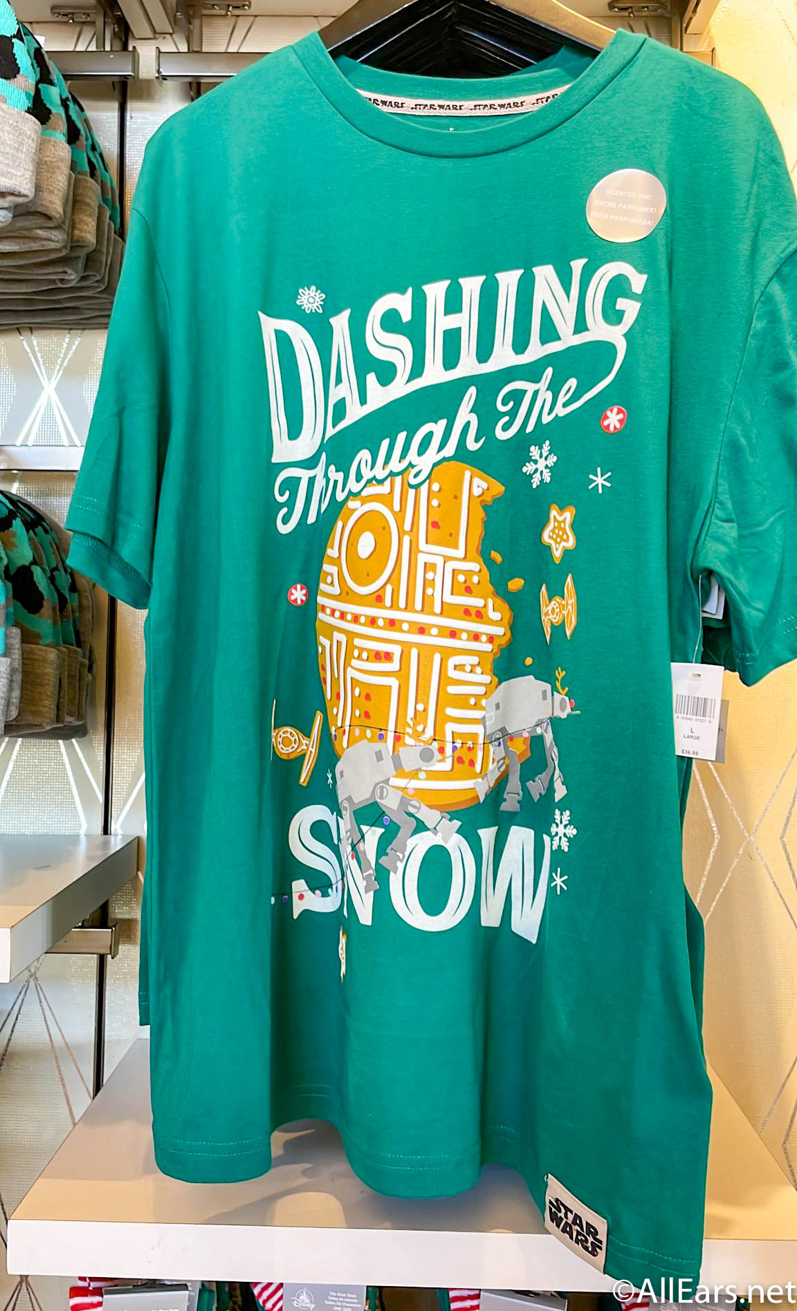 We’ll start with that gingerbread-scented collection! First, there’s the Star Wars Holiday T-Shirt that says “Dashing Through the Snow” and features a giant gingerbread Death Star on it!