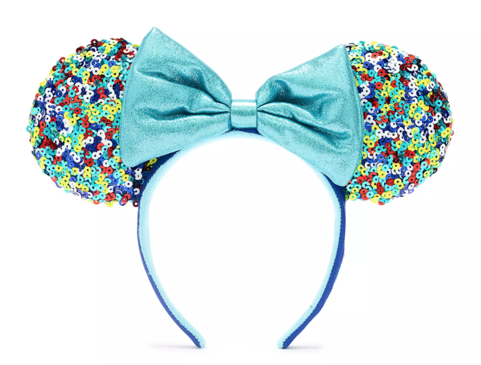 They’re an aqua-ish blue with multicolored sequins on the ears and a shimmery bow. Honestly, they remind us a lot of the Make-A-Wish ears that Disney released a while back.