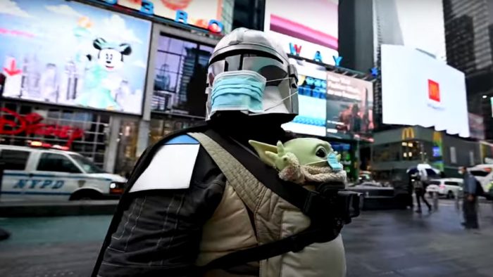 According to The Washington Post, the Maskalorian, is a man named Matt Adams, a filmmaker and improv performer, who travels around the world dressed as the Maskalorian (complete with a baby Masku wearing a GoPro camera) handing out free masks to people.