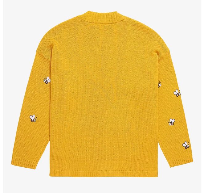 The playful button-down sweater features embroidered bees buzzing around Pooh, Eeyore, and Piglet and two flower-adorned front pockets. The bees continue on the sleeves and the back is a simple, bright shade of yellow.