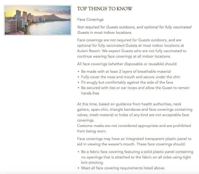 According to the Aulani website, fully vaccinated guests are no longer required to wear a face mask in most indoor locations at Aulani, a Disney Resort & Spa. Additionally, face masks are not required for guests outdoors.