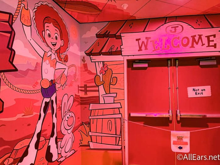 But on a recent visit to the ride, we noticed that there’s a NEW mural by the exit! It’s a sign advertising Jessie’s Trading Post, which according to the lore, is a playset that Andy found in the attic and brought downstairs. (It fits with the theme of the ride since the loading area is made to look like Andy’s bedroom.)