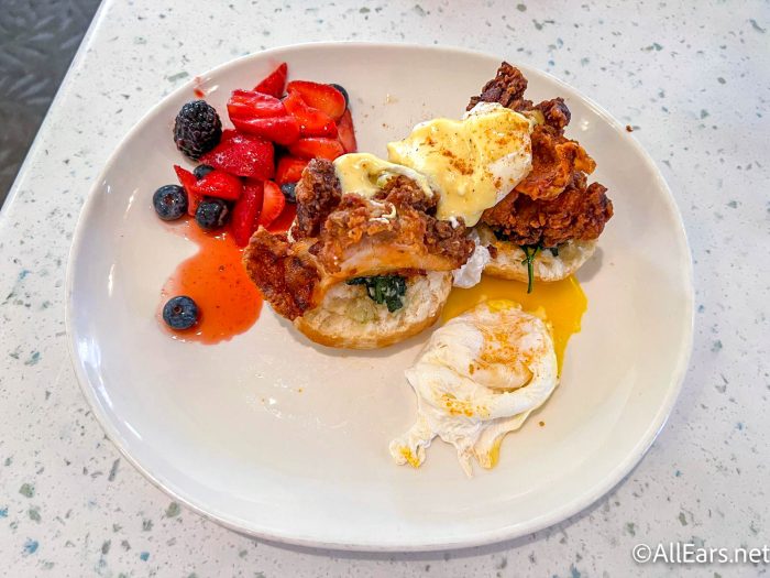 We also tried the Hot Honey Fried Chicken Benedict. This is $16 and features Poached Eggs, Sautéed Spinach, and Hollandaise Sauce, served with Fresh Fruit.