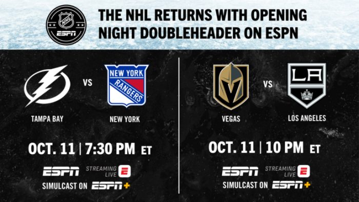 The season will begin on October 11th on ESPN with two games: Tampa Bay Lightning vs. the New York Rangers at Madison Square Garden and the Los Angeles Kings vs. the Vegas Golden Knights at Crypto.com Arena.