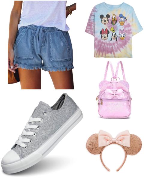 This outfit is for all the comfy dressers. Denim shorts are usually not what we would pick if we wanted to be comfortable, but these have an elastic waist and aren’t as tight as your typical pair. A t-shirt is always a good choice for park days, and of course you can’t forget your sneakers! We like bringing backpacks into the parks for hands-free carrying and we love how this one is similar to the ears without being too matchy.