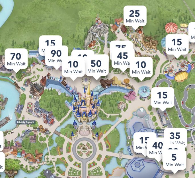 Now that you’ve seen what the crowds looked like, let’s take a look at the wait times, which we checked around mid-day. Haunted Mansion was high at 70 minutes (it is Halloween, after all!) and Peter Pan’s Flight was all the way up to 90 minutes.
