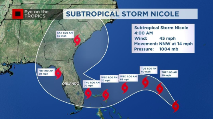 With warmer waters around the Bahamas, it’s possible that Nicole will reach hurricane strength. Experts are predicting that it will arrive close to Florida’s coast by 2AM on Thursday with 70 mph winds and gusts up to 85 mph. It could make landfall “somewhere between West Palm Beach and Brevard County,” and then travel northwest across the state. It may arrive close to Orlando by mid-Thursday.