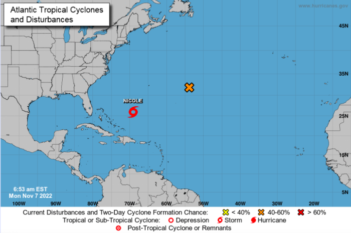Nicole formed early Monday morning in the Atlantic and currently has winds up to 40 miles per hour. The forecast predicts “it will transition to a tropical system with a more defined eye with higher wind speeds around the eye at the center of its circulation by two to three days” (Orlando Sentinel).