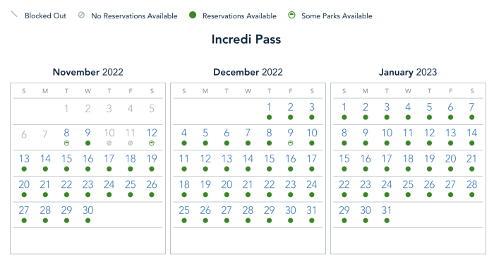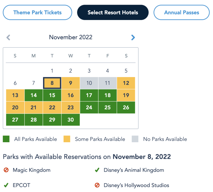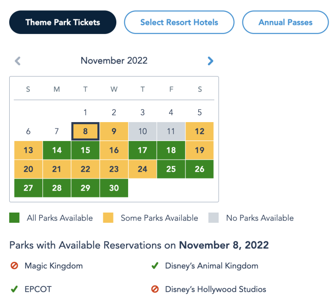 And for the Pixie Dust Pass, all four parks are sold out on November 10th and 11th, with Hollywood Studios also sold out on November 8th. Pixie Dust Passholders are blocked out on November 12.