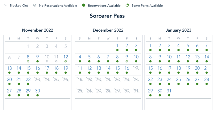 For the Sorcerer Pass, all four Disney Parks are sold out on November 10th and 11th. Additionally, Hollywood Studios is sold out on November 8th and the 12th, and Magic Kingdom is sold out on November 12th. These same dates apply to the Pirate Pass as well.