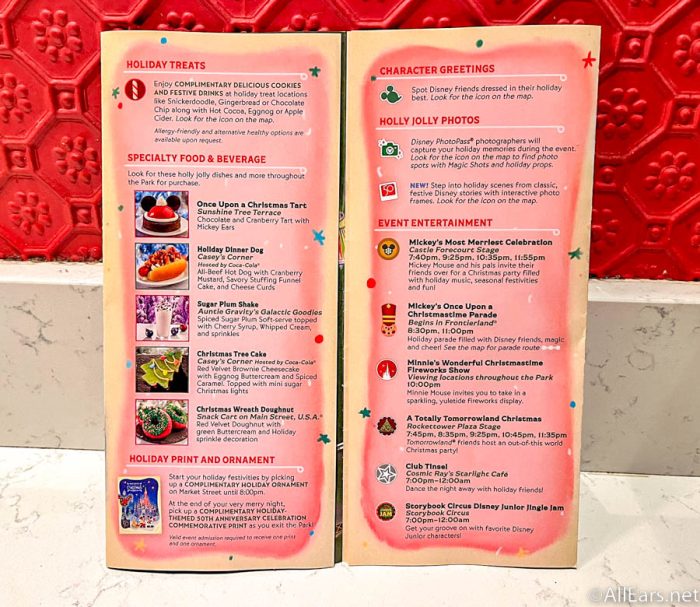The other side has a classic map of Magic Kingdom, but with the additions of special areas for the party, like the holiday ornament location on Main Street, U.S.A.
