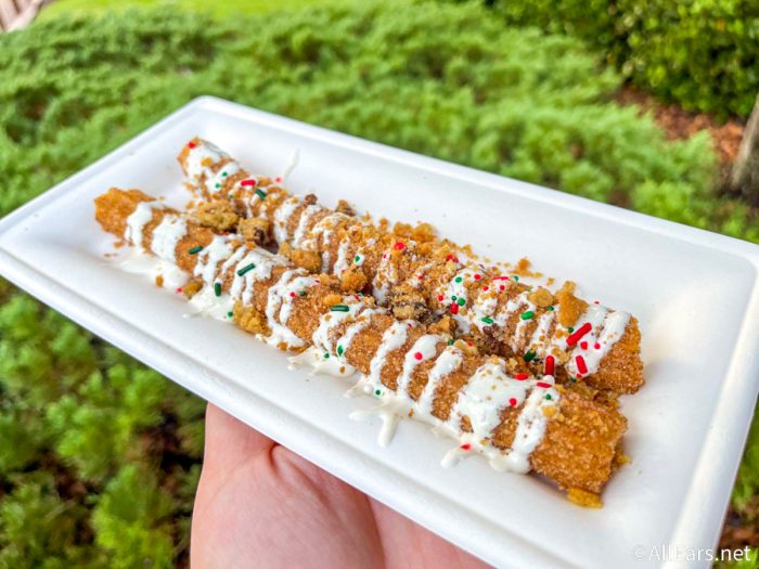 This is a churro served with marshmallow cream, cookie crumbles, and Christmas sprinkles. You can find it at the carts around Main Street, U.S.A.