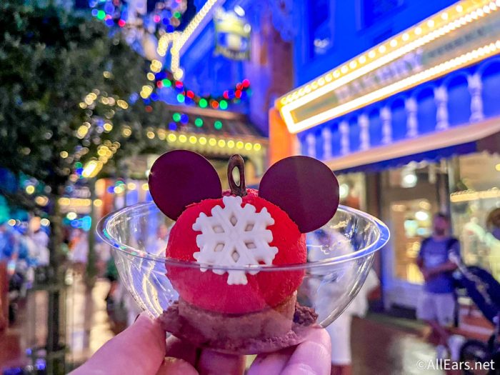And, check out this beautiful treat! It’s the new Mickey Mousse Ornament Treat from Main Street Bakery.