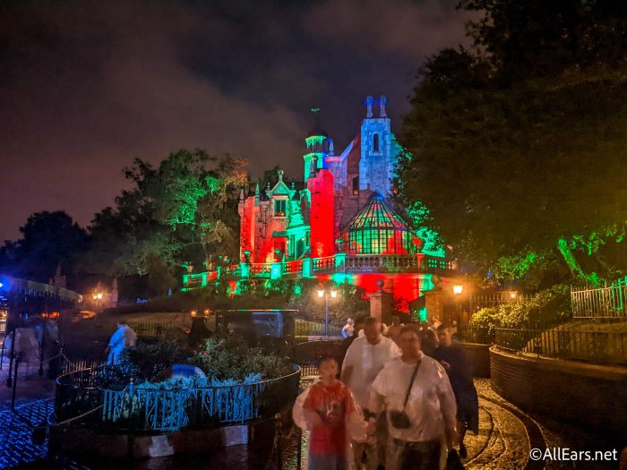 Although the actual Haunted Mansion ride does not have a holiday overlay, the outside was lit up with red and green lights!