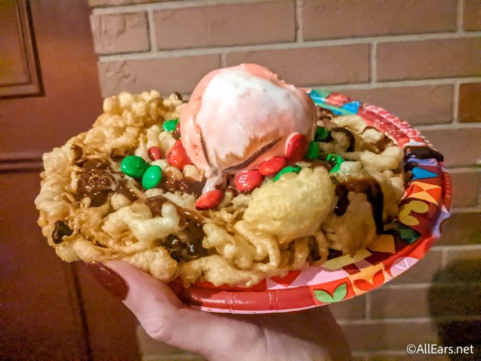 Sleepy Hollow also has the Funnel Cake Sundae with peppermint ice cream, M&M’S chocolate candies, and hot fudge served on funnel cake.
