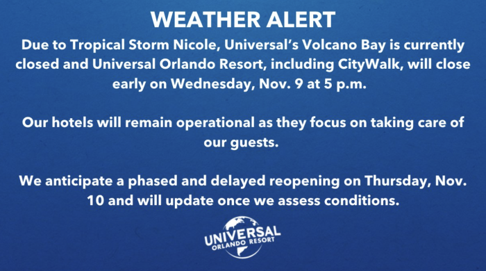 Universal Orlando previously announced that their water park Volcano Bay would be closed on November 9th, but now the theme parks are impacted.