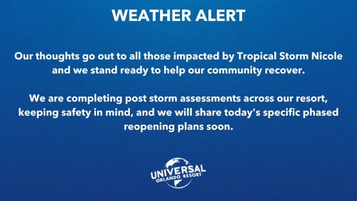 UPDATE: On November 10th, Universal shared an update that they would be assessing damage and sharing reopening plans from there.
