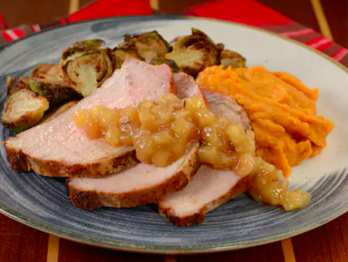 - Christmas Dinner: Dijon-rubbed pork loin with bourbon sweet potato purée, crispy Brussel sprouts, and apple fennel chutney (New)