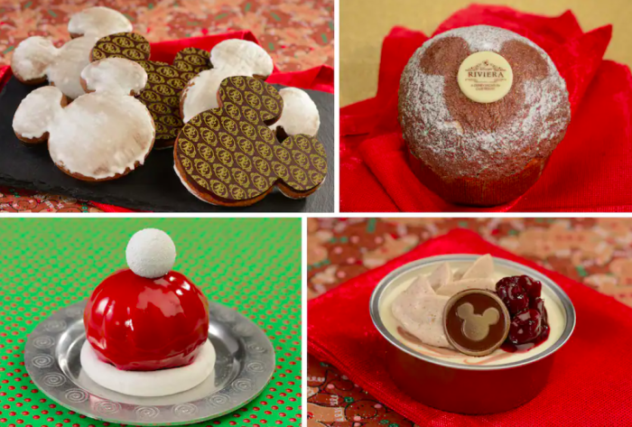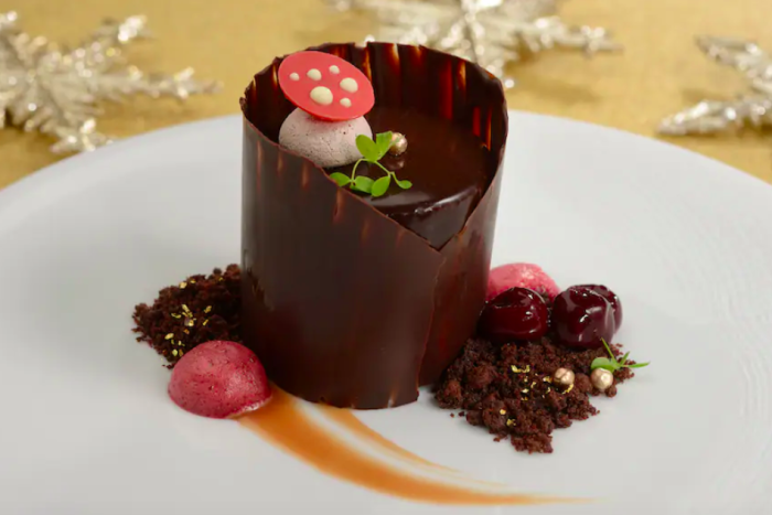 - Vanilla, Cherry, and Gingerbread Cheesecake: Vanilla cheesecake with chocolate cheesecake swirl, Morello cherries, whipped gingerbread panna cotta, and milk chocolate Mickey coin (New)