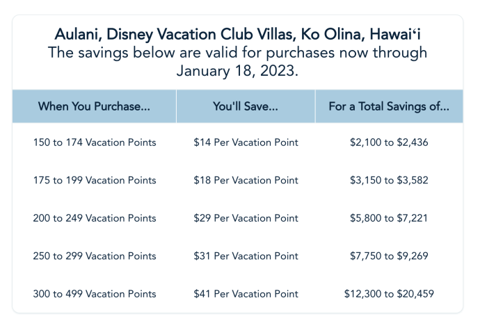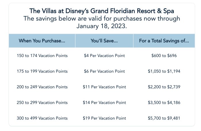 The way the deal works is that, when you purchase for select Disney resorts, you can save more the more points you buy. For example, at Disney’s Grand Floridian Resort, you can save up to $19 per vacation point depending on how many you purchase.