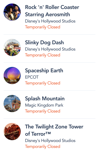At one point, in Disney’s Hollywood Studios, Rock ‘n’ Roller Coaster, Slinky Dog Dash, and Tower of Terror were all closed. As of 10:45AM, Rock ‘n’ Roller Coaster had reopened, but Rise of the Resistance and Tower of Terror were still closed. Later, Mickey & Minnie’s Runaway Railway joined the “temporarily closed” list.