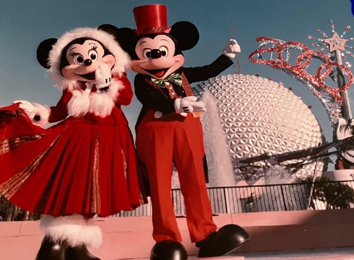 In this photo, Mickey appears to be placing a hook on top of Spaceship Earth, giving the impression that the giant dome is about the become the world’s largest Christmas tree ornament.