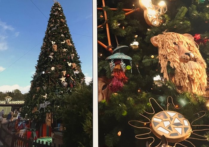 The photo, right, shows the intricate detail expressed on the giant fir, with a lion’s head and a hidden Mickey among the clever ornaments.