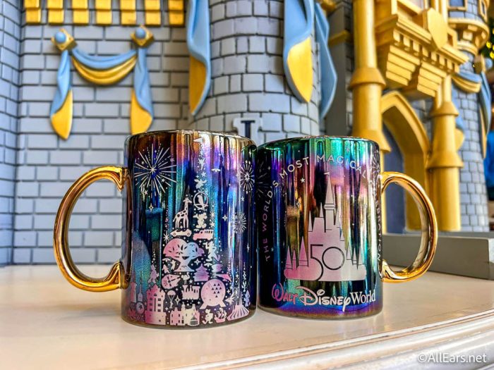 There are park icons that create the shape of a castle on one side of the mug and the 50th anniversary logo is on the other side. It’s finished with an EARidescent shine and a gold handle. It’ll cost you $19.99.