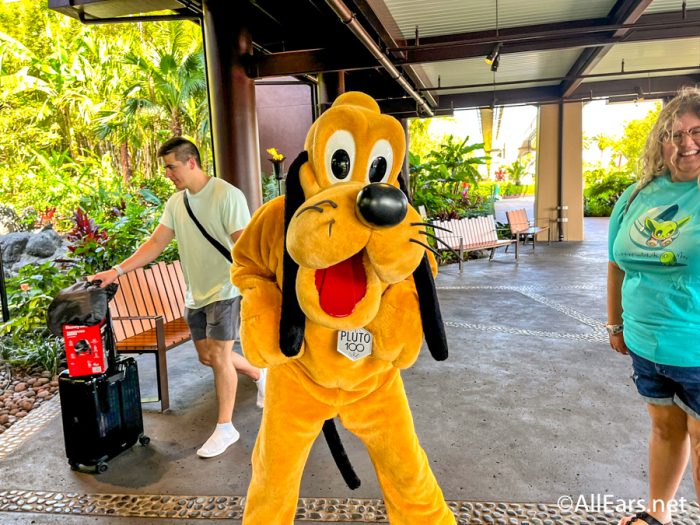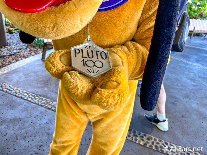 We stuck around a few minutes, and Donald, Pluto, and Goofy came out, donning their 100th anniversary attire! Donald looked dashing in his shiny vest…