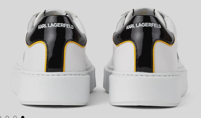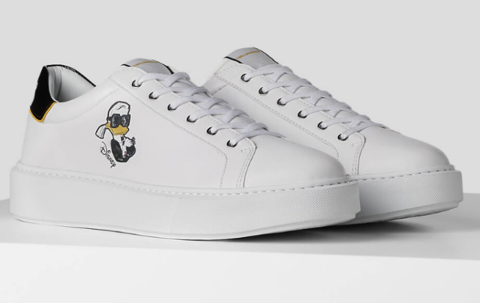 The shoes have a “Karl-inspired Disney print” with the Donald design on the side…