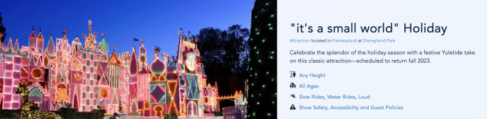 Thus far, the Disneyland website only notes that the holiday overlay will return for “fall 2023,” but does not specify on what date it’ll return. Typically, what we’ve seen is that the traditional “it’s a small world” ride will close starting around the end of October while the transformation takes place and then reopen (usually in early to mid-November) with its festive look. We’ll keep an eye out for updates as to when the ride will close and reopen later this year.