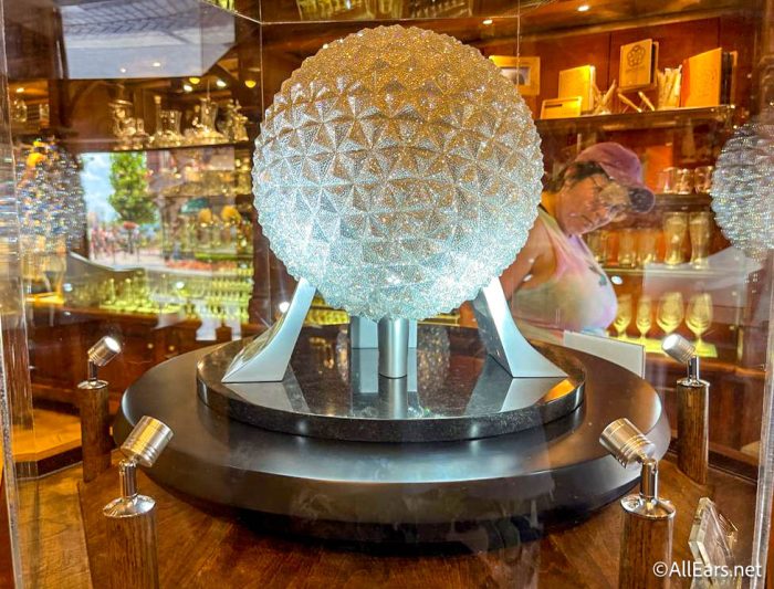The display lights hit the crystals just right making it hard for visitors to resist this pricey souvenir (please help, our self control is weak when it comes to Disney items). Next time you are in EPCOT, be sure to check out this beauty!