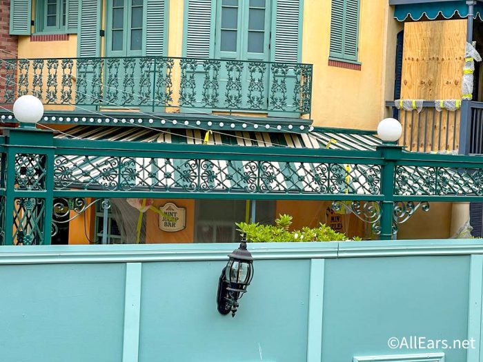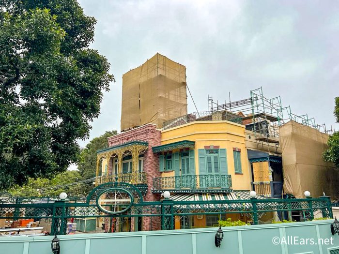 We know that Tiana’s Bayou Adventure is coming to Disney World and Disneyland in 2024, but we’re also looking forward to the new Tiana’s Palace restaurant that’s taking the place of French Market. While we were walking around the park recently, we noticed that the restaurant really is starting to transform!