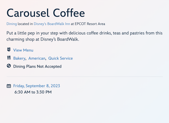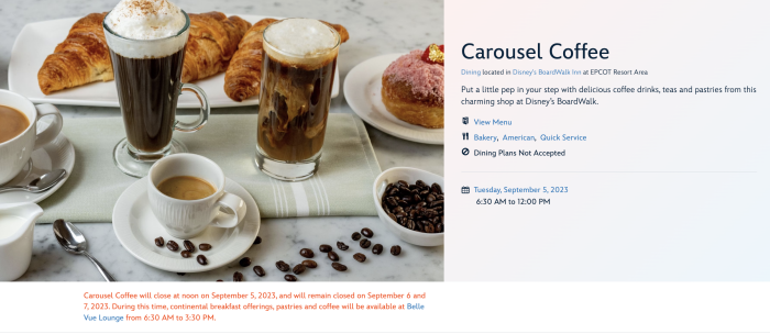 Disney announced that Carousel Coffee would CLOSE at noon on September 5th, 2023, and remain closed on September 6th and 7th, 2023.