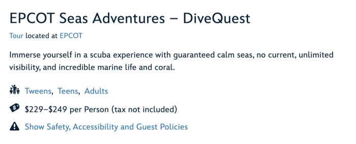 The EPCOT Seas Adventures — DiveQuest is a super unique experience — but now you’ll have to pay between $229 to $249.